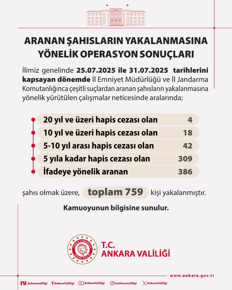 ANKARA (İGFA) – Ankara Valiliği, il genelinde aranan şahısların yakalanmasına yönelik 25-31 Temmuz 2025 tarihleri arasında yürütülen operasyonların sonuçlarını kamuoyuyla paylaştı.