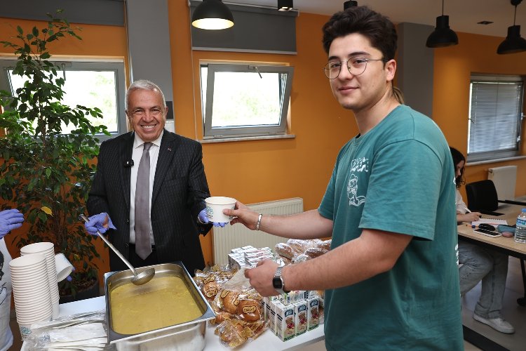 Başkan Şadi Özdemir, daha sonra çorba ve soğuk sandviç ikramında bulundu. Başkan Şadi Özdemir, doldurduğu çorba kaseleri tek tek öğrencilere vererek, “Afiyet olsun” dedi.