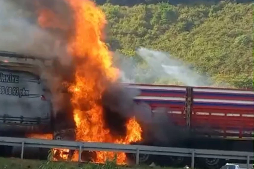 Çıkan yangında çarpan tır kullanılamaz hale geldi.