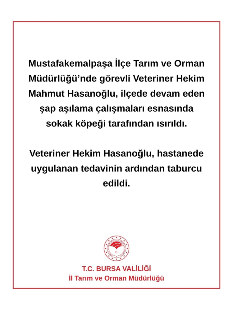 BURSA (İGFA) – Bursa’da Mustafakemalpaşa İlçe Tarım ve Orman Müdürlüğü’nde görevli Veteriner Hekim Mahmut Hasanoğlu, ilçede devam eden şap aşılama çalışmaları sırasında bir sokak köpeği tarafından ısırıldı.