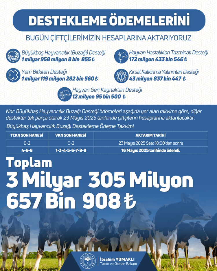 Bakan Yumaklı, “Çiftçimize destek, üretime güç, Anadolu’ya bereket oluyoruz. 3 milyar 305 milyon 657 bin TL destekleme ödemesini bugün itibarıyla çiftçilerimizin hesaplarına aktarıyoruz. Hayırlı ve bereketli olsun” dedi. Bakan Yumaklı, destek ödemelerinin detaylarını paylaştı.
