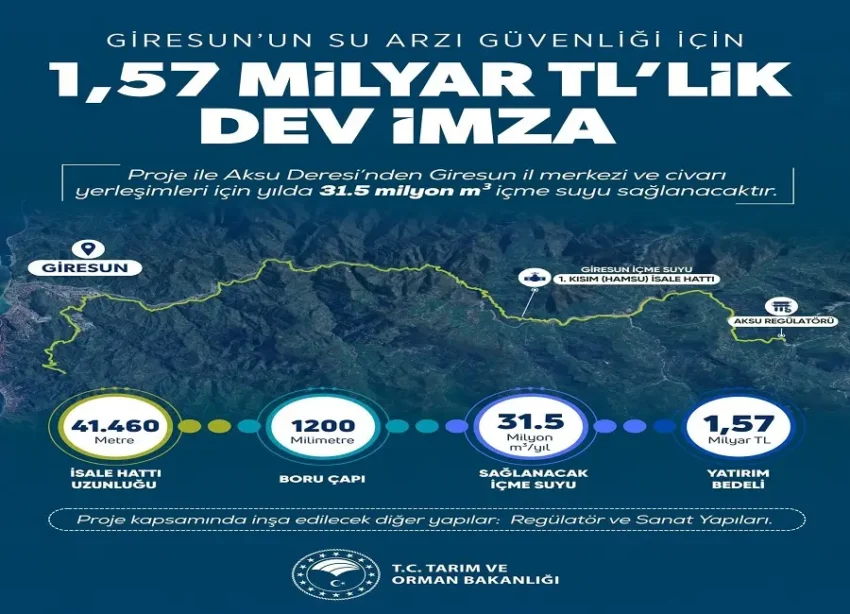 “Giresun’umuz için hayati öneme sahip içme suyu projemizde artık yeni bir aşamaya geçmenin mutluluğunu yaşıyoruz. Tarım ve Orman Bakanımız Sayın İbrahim Yumaklı’nın talimatlarıyla, DSİ ve Giresun Belediyemiz arasında imzalanan protokol kapsamında; Aksu Deresi’nden il merkezimize ve üç ilçemize yıllık 31,5 milyon metreküp içme suyu sağlayacak projemizin ilk etap inşaat sözleşmesi imzalandı. 1 Milyar 570 milyon TL yatırım bedeliyle hayata geçirilecek ve 41 bin 460 metre uzunluğunda olacak isale hattı sayesinde Giresun’umuza güçlü ve sürdürülebilir bir su arzı kazandırıyoruz. Giresun’umuz için her platformda çalışmaya, her kapıyı çalmaya, tüm imkânları seferber etmeye devam edeceğiz. Bu önemli projenin hayata geçirilmesinde büyük destekleri olan Tarım ve Orman Bakanı İbrahim Yumaklı’ya, Giresun Milletvekilimiz Ali Temür’e ve emeği geçen herkese teşekkür ediyorum. Şehrimize ve hemşehrilerimize hayırlı olsun.”