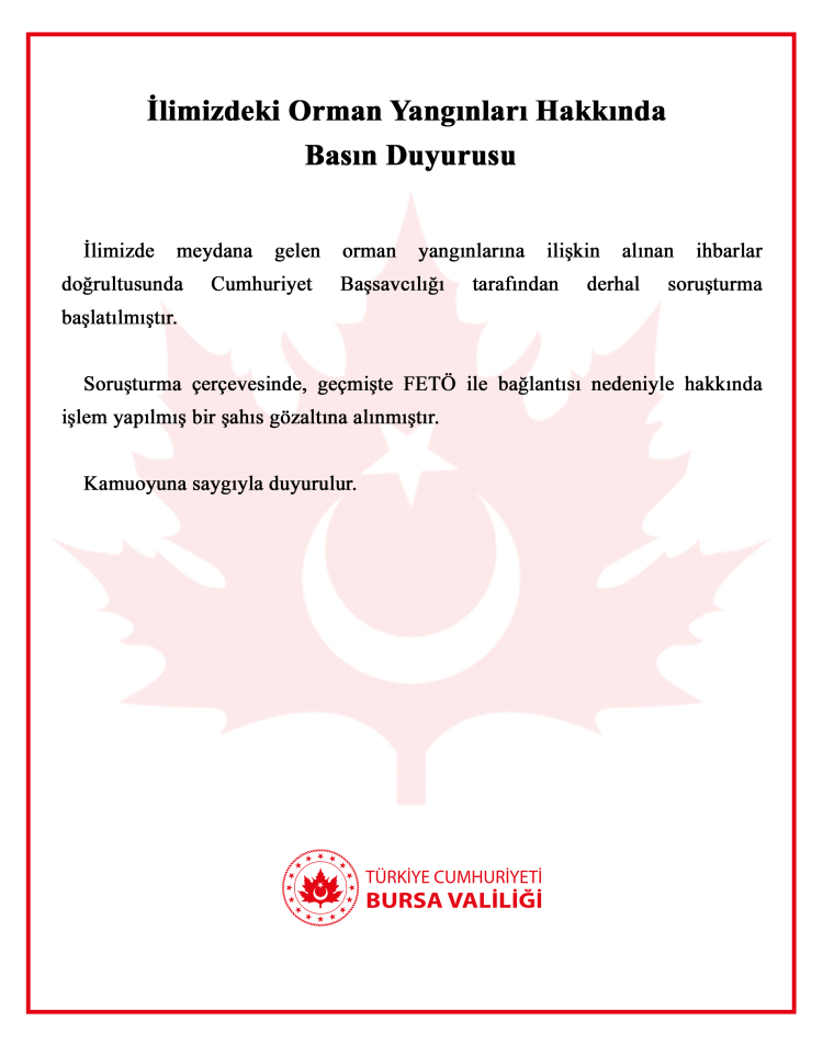 Bursa Valiliği’nden yapılan açıklamada, söz konusu yangınlara ilişkin alınan ihbarlar kapsamında Cumhuriyet Başsavcılığı tarafından derhal soruşturma başlatıldığı belirtilerek, gözaltına alına şüphelinin, soruşturma kapsamında, geçmişte FETÖ ile bağlantısı dolayısıyla hakkında işlem yapılmış bir şahıs olduğu bildirildi.