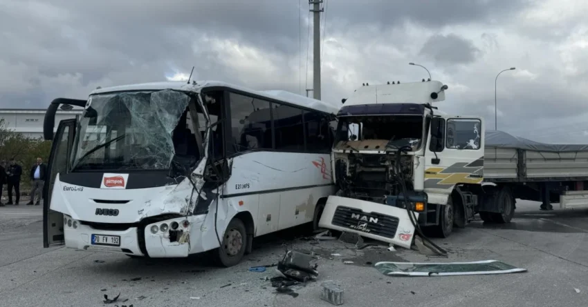 Olay, Karaman-Ereğli kara yolundaki bir kavşakta gerçekleşti. Edinilen bilgiye göre, M.Ç. idaresindeki işçi servisi midibüsü, H.A. yönetimindeki tır ile çarpıştı. Çarpışmanın şiddetiyle midibüste bulunan yolcular ve sürücü yaralandı.