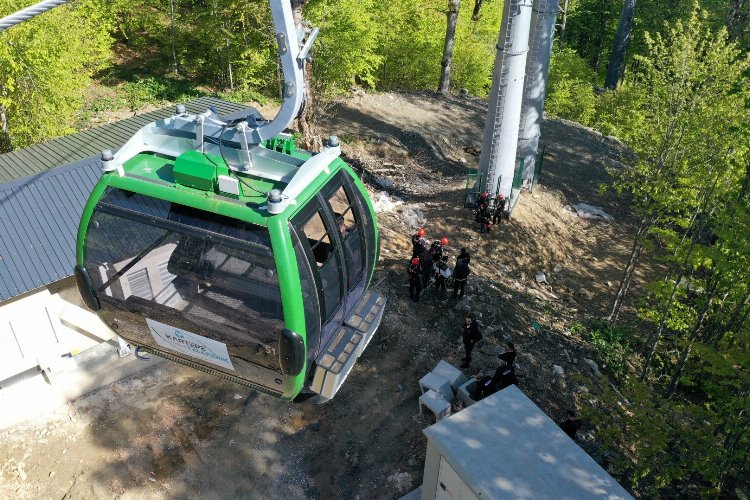 Kocaeli Büyükşehir İtfaiyesi ve Ulaşımpark personeli, yüksek teknolojiye sahip Kartepe Teleferiğinde metrelerce yükseklikte güvenli çalışma ve kurtarma tatbikatı yaptı