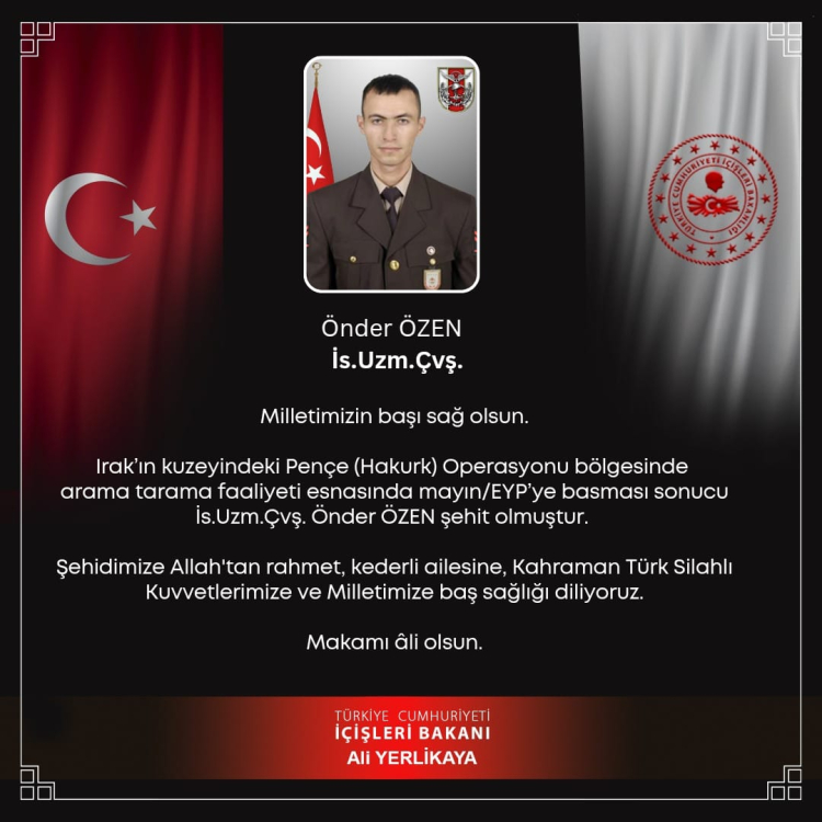 ANKARA (İGFA) – Alınan bilgiye göre Irak’ın kuzeyindeki Pençe Hakurk Operasyon bölgesinde arama tarama faaliyeti yapan İstihkam Uzman Çavuş Önder Özen el yapımı mayına bastı.