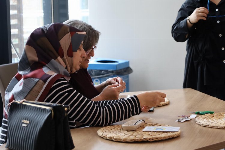 Sakarya Büyükşehir Belediyesi Sosyal Gelişim Merkezi (SGM) Engelsiz Hobi Kursu’nda özel çocukların annelerine “miyuki” tekniğiyle bileklik yapımı öğretiliyor.