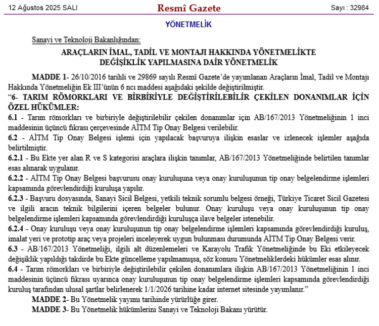 Bugünkü Resmi Gazete’de yayımlanan yeni düzenleme ile tarım römorkları ve birbiriyle değiştirilebilir çekilen donanımlara yönelik tip onay belgelendirme süreçleri netleşti. Düzenleme, tarım römorklarının üretim ve onay süreçlerini AB standartlarıyla uyumlu hale getirerek sektörde kalite ve güvenilirliği artırmayı hedefledi.
